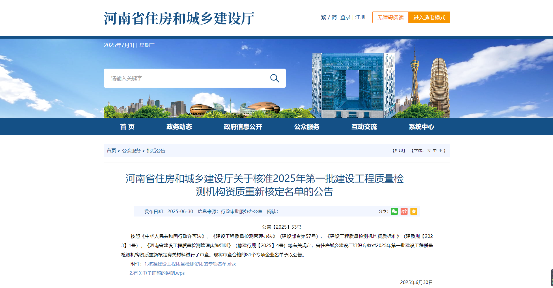 • 熱烈祝賀我司通過河南省住建廳2025年第一批建設工程質量檢測機構資質重新核定!!!